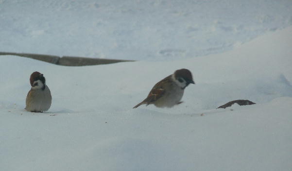 雀A 「ねえ~まだ私達のお気に入りのバードテーブル、空かないわ~」雀B 「あのシメ達の食べこぼし、雪の中探すと、いっぱいあるわよ~」雀C 「チュンチュン、私の分も探してよ・・・」向かって左の雀Aが見ている先には あのギャング顔の 「シメ35」今朝は見張り役まで連れてきた!!