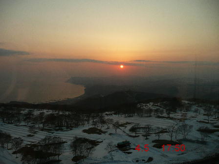 案内されたお部屋は、レイクサイドこのホテルは、洞爺湖と噴火湾(内浦湾)の両方を天上から見下ろす事ができます内浦湾に沈む夕日 これは、11階のシーサイドから目前に広がっているまだ雪の残るゴルフ場は緑が濃くなると、またちがった風景に映るのでしょう そして、翌朝、お部屋から眺めた日の出靄がかかっていましたが、太陽がゆっくりと昇る天体ショーにしばし見とれやがて、澄んだ湖面に太陽が映しだされただ、ただ感動 部屋からバスローブで行ける 温泉 「山泉」和の趣のアプローチを通ると、檜風呂コンパクトながら、檜の香りと清潔感、そしてここでも外の景色が一望でき、極楽~サルコジさんもこの檜風呂で「シャンソン」などを口ずさむかも??・・・などと、まさかね・・・ちゃんとお部屋にプライベイトバスがあるんですよね。アメニティーがまた、すごい!なんと、ブルガリ!! さらにレディスセット(奥の箱)にはバスビーズやあぶらとり紙、ヘアバンドなどなど数点そして、朝刊が配られるホテルはよくあるけれどここは、到着日の夕刊もお部屋に配達され、至れり尽くせり