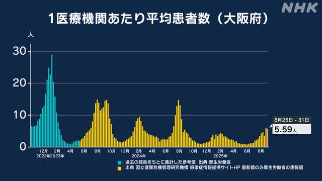 (本日更新2)<新型コロナ情報(厚労省から毎週金曜日(9/5)発表の最新情報)>地元大阪府で、先週1週間(8月25日〜8月31日)に報告された新型コロナウイルスの定点医療機関あたりの患者数は、全国的にも流行の中ですが、少し減少に転じました。(大阪府平均5.90→5.59人、全国平均8.73→8.37人)外出の際は、状況に応じて適切な感染予防対策の実施が必要です!!地元大阪府の1医療機関あたり平均患者数(NHKのサイトから抜粋)全国平均(NHKのサイトから抜粋)