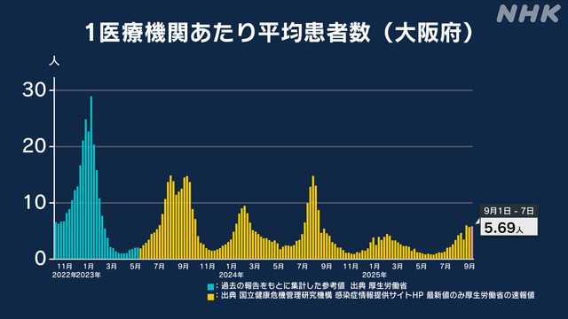 (本日更新2)<新型コロナ情報(厚労省から毎週金曜日(9/19)発表の最新情報)>地元大阪府で、先週1週間(9月8日〜9月14日)に報告された新型コロナウイルスの定点医療機関あたりの患者数は大幅に増加し、全国的には高止まりの状態です。インフルエンザ患者数も増加傾向です。(大阪府平均5.69→7.35人、全国平均8.12→8.43人)(参考:インフルエンザ患者数 大阪0.36→0.75人、全国平均0.50→0.72人)外出の際は、状況に応じて適切な感染予防対策の実施が必要です!!地元大阪府の1医療機関あたり平均患者数(NHKのサイトから抜粋)全国平均(NHKのサイトから抜粋)