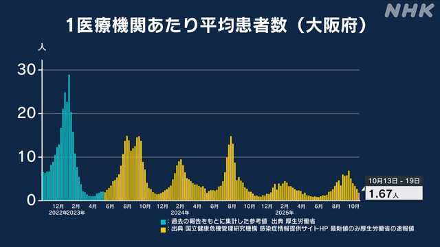 (本日更新2)<新型コロナ情報(厚労省から毎週金曜日(10/24)発表の最新情報)>地元大阪府で、先週1週間(10月13日〜10月19日)に報告された新型コロナウイルスの定点医療機関あたりの患者数は、全国的にもさらに減少傾向が継続しています。インフルエンザは、引き続き増加傾向です。(大阪府平均2.57→1.67人、全国平均3.72→2.57人)(参考:インフルエンザ患者数 大阪1.88→2.74人、全国平均2.36→3.26人)外出の際は、状況に応じて適切な感染予防対策の実施が必要です!!地元大阪府の1医療機関あたり平均患者数(NHKのサイトから抜粋)全国平均(NHKのサイトから抜粋)
