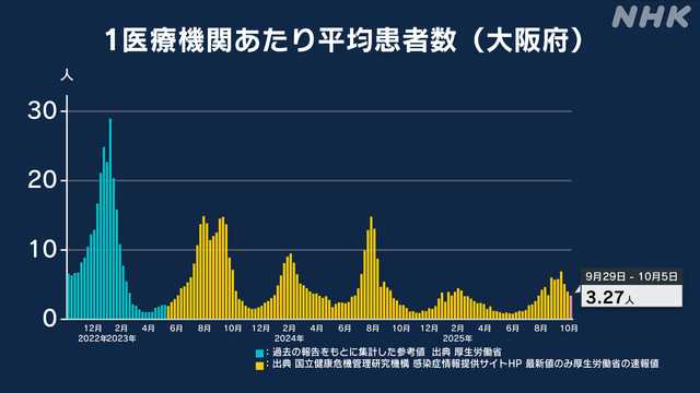 (本日更新2)<新型コロナ情報(厚労省から毎週金曜日(10/10)発表の最新情報)>地元大阪府で、先週1週間(9月29日〜10月5日)に報告された新型コロナウイルスの定点医療機関あたりの患者数は、全国的にも引き続き減少傾向になりました。インフルエンザは引き続き増加傾向です。(大阪府平均3.90→3.27人、全国平均5.87→4.82人)(参考:インフルエンザ患者数 大阪1.21→1.66人、全国平均1.04→1.56人)まだまだ外出の際は、状況に応じて適切な感染予防対策の実施が必要です!!地元大阪府の1医療機関あたり平均患者数(NHKのサイトから抜粋)全国平均(NHKのサイトから抜粋)