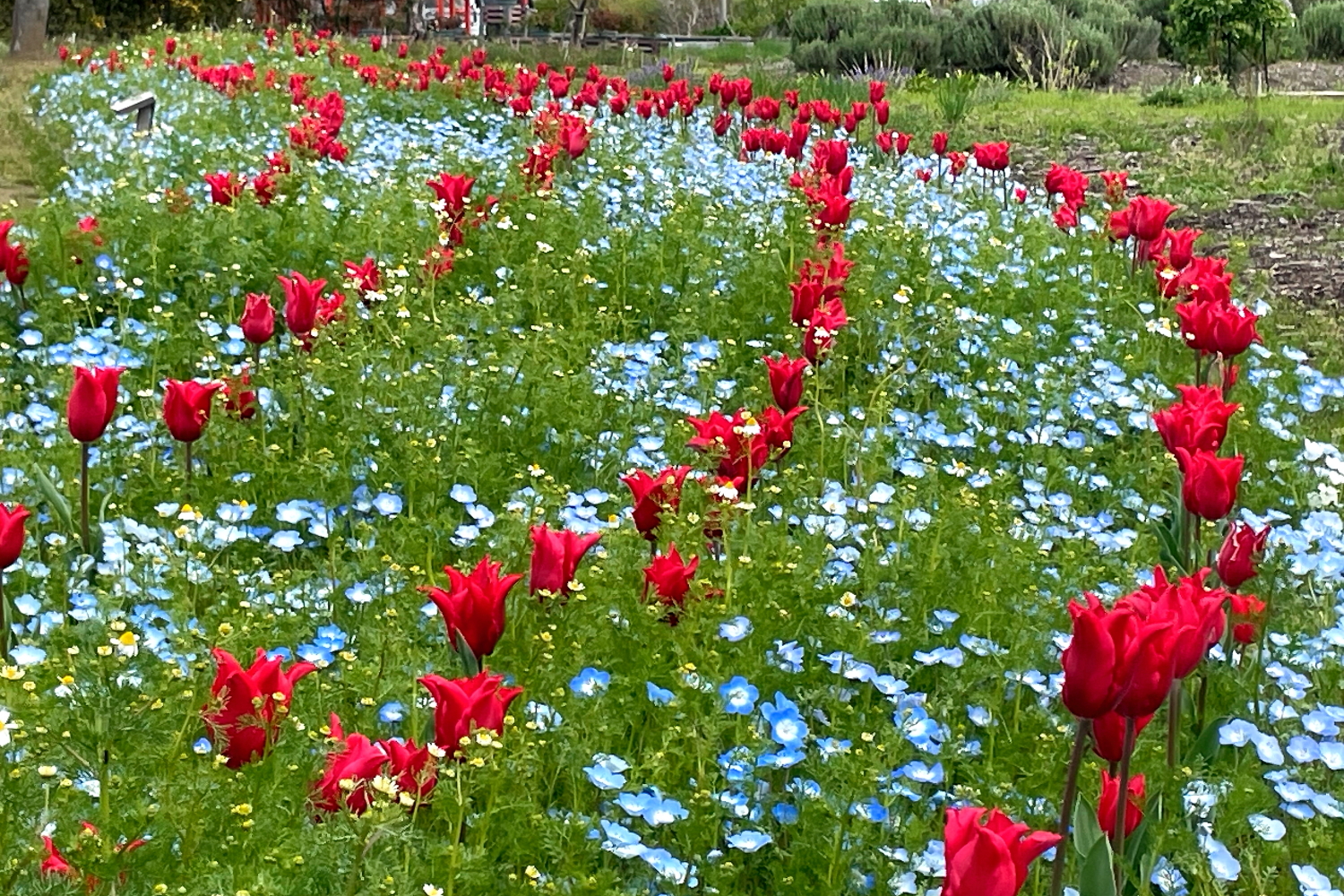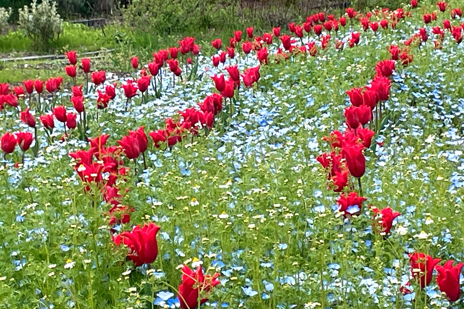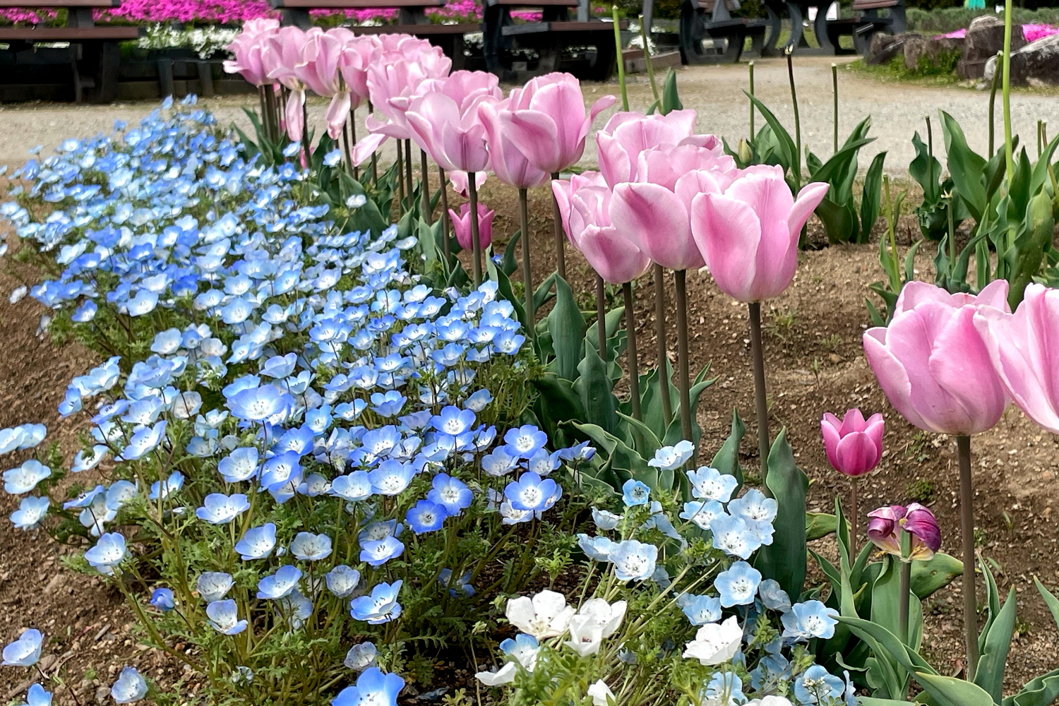 ☆リサイクル環境公園の「白いネモフィラ」と「ネモフィラとチューリップのコラボ」