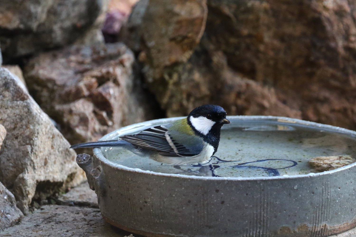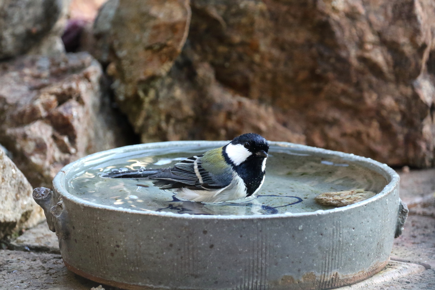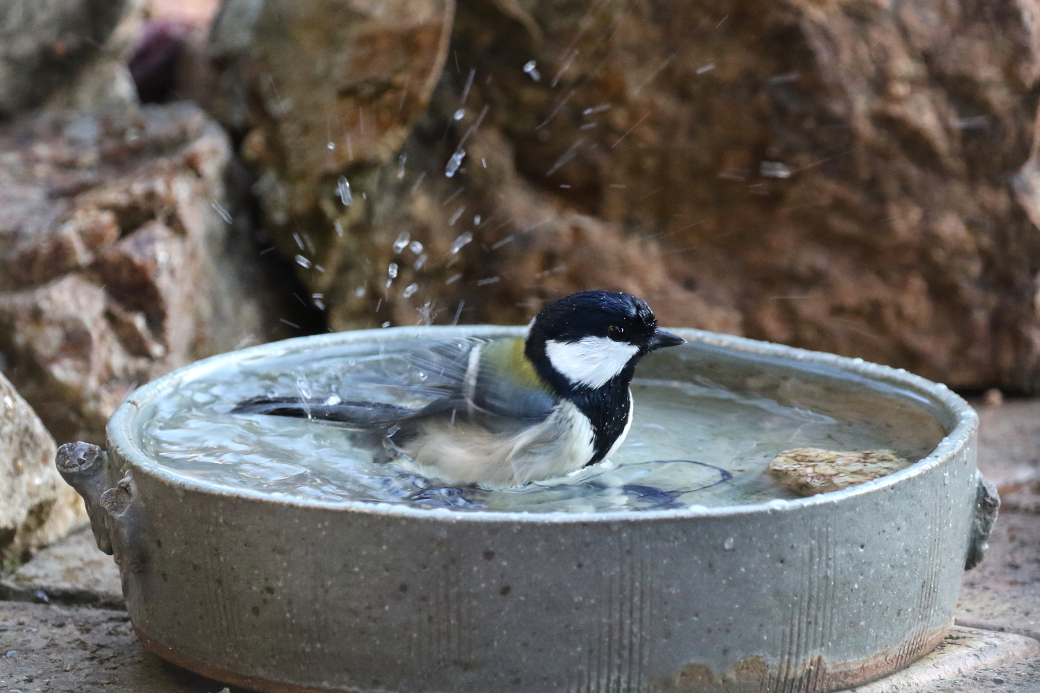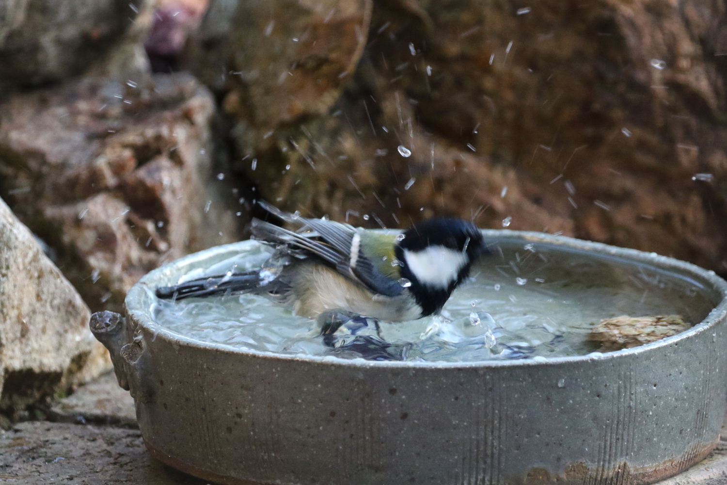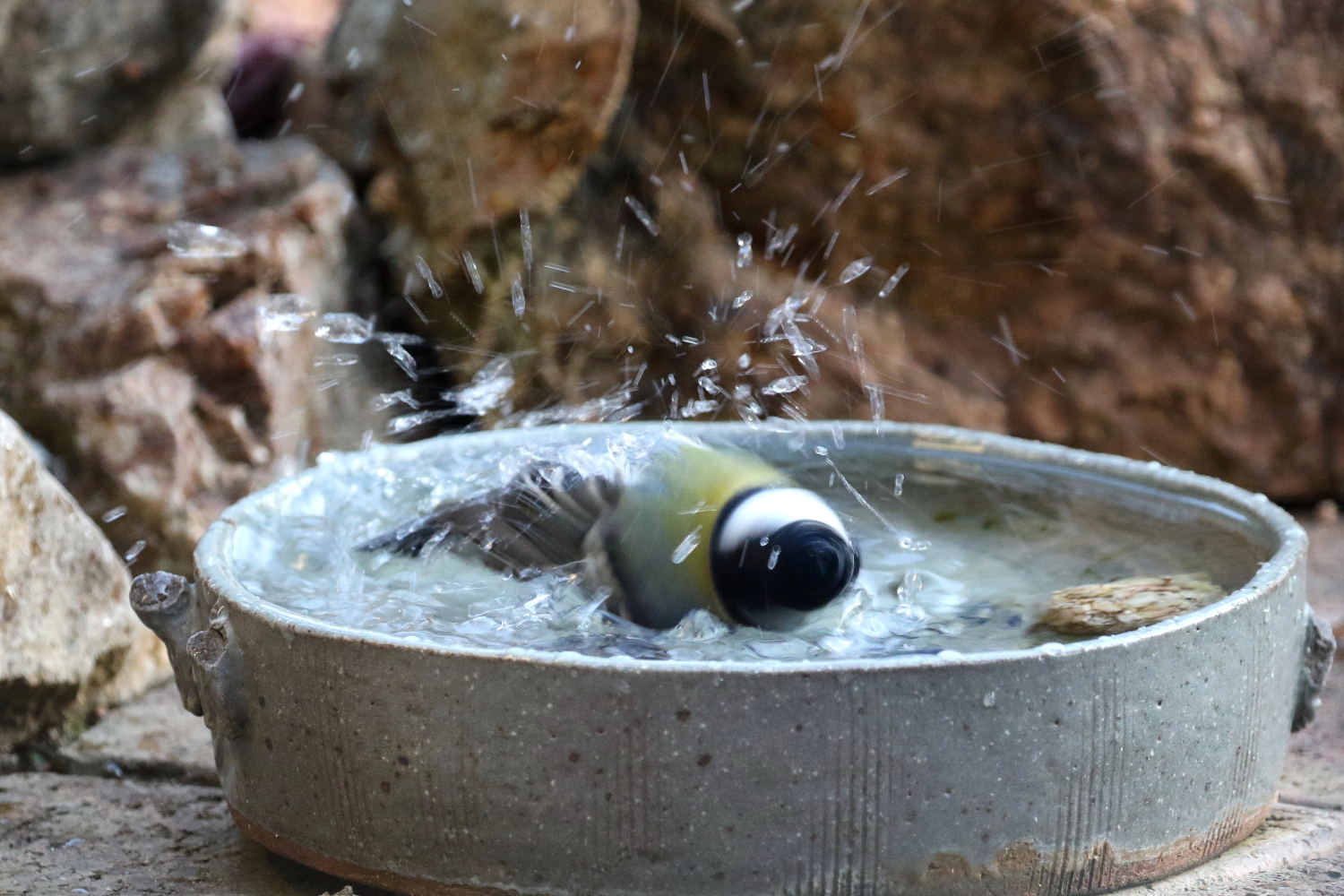 お庭にペアでやって来て、気持ち良さそうに水浴びしていく「シジュウカラ」です(^-^)