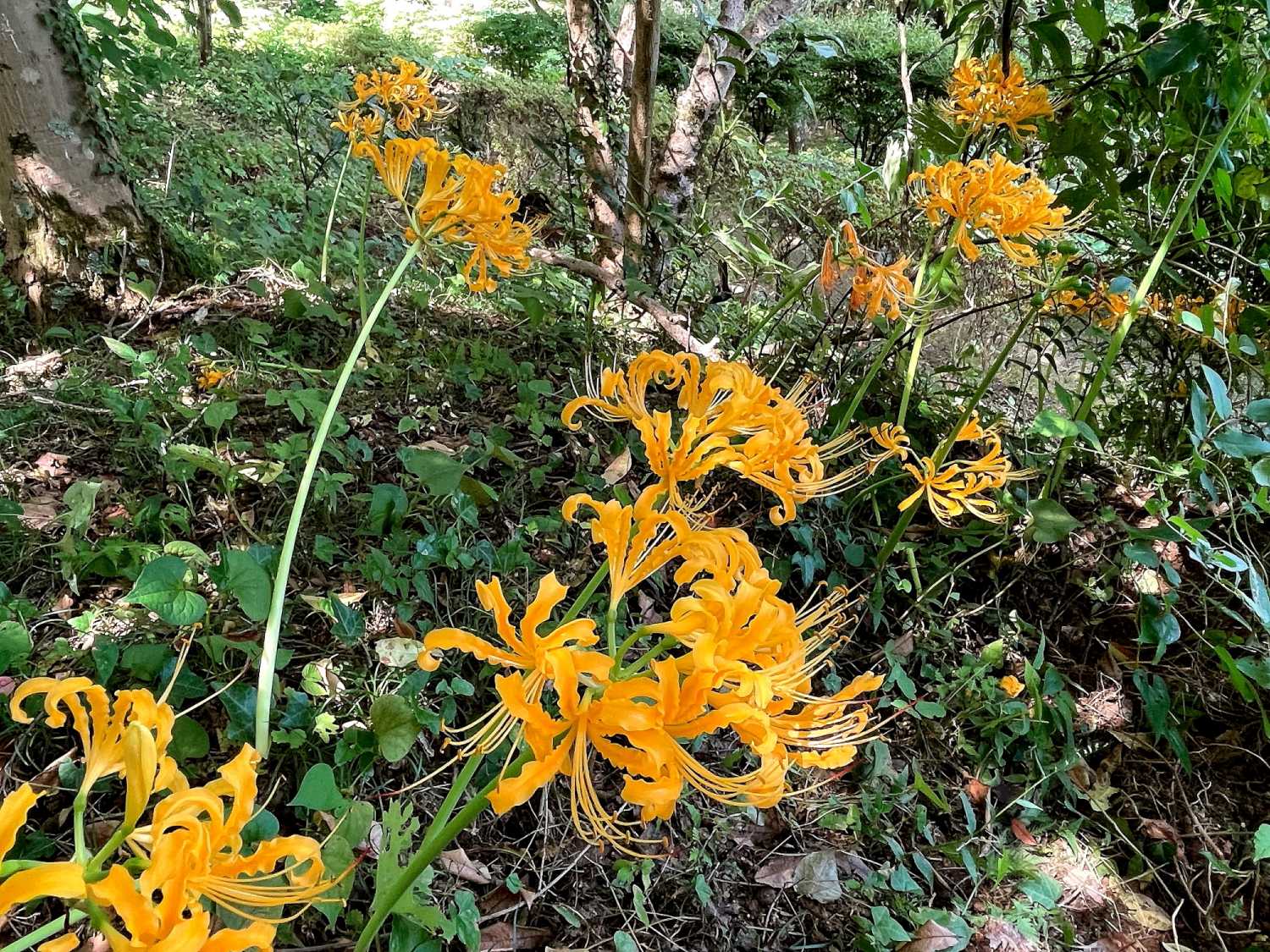 岩湧の森の一画で、黄色い彼岸花の「ショウキズイセン」が、白花も混じって綺麗に咲き誇っていました(^-^)