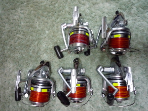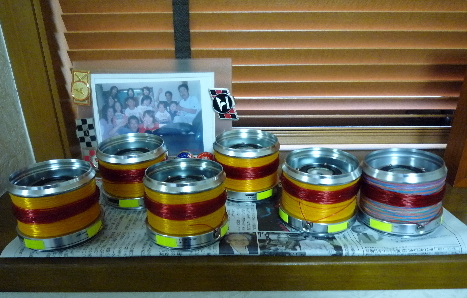 釣道具達3です。 せっかくの休日ですが、昨日新人の歓迎会がありその後、樋口君の家に行き一杯お酒も入ったので今日の釣行は中止です11月に入って活動します。 で、リール達の話です。 置き竿用のメインリール達です。シマノさんのパワーエアロです。ほとんどこのパワーエアロシリーズをずっと使用しています。磯投げが多かったのかハンドルなどのガタツキは出てきます。一番の良いところは、クイックドラック付きですばやい対応ができるところですね・・・・・・道糸は4号ナイロンをスタメンにし5号ナイロン・3号PE・2.5号PEを補欠にしています。下の写真で、スプールのすそに黄色い蛍光シールが間隔あけて張っているのですが、どうしてって言うと複数の竿を置き全てのリールをドラックフリーにしていると『ジー』ってドラックの音が鳴ったときどの竿に当りがあったのか即わかりません。対応に遅れますスプールが回転した事を目で確認することができるのです。それと、力糸は赤を使うのは、大物を掛けたとき必死に巻き上げて大変なとき、『あと15M』がんばれの目印のためです。 旧パーワーエアロです。今、は出番はほとんどありませんがこの子も良く活躍してくれました。5台ありましたが、平会長に引き取ってもらいました。 上のリール達3台は、きすの引き釣り用です。シマノさん2台 XT-SSとMGですダイワさん1台 新Z45です。 この内容については、又書き込みします。