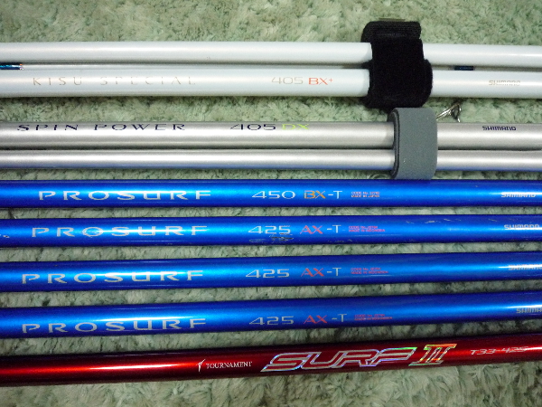 今日は、釣り道具達2でいきます。 まず、竿達の紹介です。 上から SHIMANO キススペシャル 405BX+ キスの引き釣り用SHIMANO スピンパワー 405EX キスの引き釣り用SHIMANO プロサーフ 450BX-T 置き竿用 特に磯投 シモリをクリアーするSHIMANO プロサーフ 425AX-T 置き竿用 メインDAIWA トーナメントサーフ2 33-425 置き竿用 初めてダイワ購入 釣行テスト中 ほとんど出番がないですが SHIMANO TWIN POWER SF 425AX 3本 この子も10年前は良い仕事をしてくれました なつかしい SHIMANO TWIN POWER 425AX この子も、15年前ごろ良い仕事してくれました。今は、ガイドも取り外しストリップ状態で大事に保管しています。投げ釣りを、本格的に始めたのが25年前でした。ほとんど磯投げがメインでした。根掛対応・大物対応で425のAXクラスをそろえていました。今のメイン竿は青竿です。その中でも450BX-Tは、お勧めですどうしてって言うと磯投げでシモリが手前にある場合かわせる事で魚を掛けたとき425クラスより沖から魚がボッコとあがってきますただ、キャスティングには、少しなれないとタイミングが合いにくいですねテンプラになりやすいです。と、先日購入した、ダイワの赤サーフは、細身で軽くいい感じです、近々中に磯でインプレしてみます。ここ3・4年ほど前からキスの数釣りに興味をもち修行中です。キスの数釣りの内容と道具達も紹介していきますね