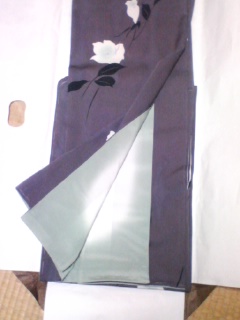 「仕立て上がりました」の表題のメールが来ると、お仕立てに出していた着物のできあがりです。きくやさんのオークションで落札していた「東レシルック 紫地花柄着尺」が仕立てあがったとの連絡でした。しめしめ、これで野庵の歌留多会は、これを着ようなどと算段して、いつでも送ってくださいと返信をしました。そして昨日の夜に到着しました。^^ 反物をウェブ上の画像でみた時よりも、抑えめの色目です。そして八掛は、店長さんのお見立てで緑のぼかし八掛でございます。いゃあ月末に着るのが楽しみですぅ。帯はなににしょうかな・・などと考えつつ・・ですね。ハレという感じにコーディネイトしたいものです。