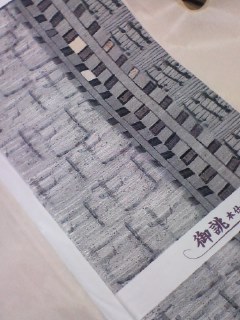 オークションで落札して、お仕立てに出していた「とみや」の帯が仕立てあがってきました。昨日、届いていたのですが残業で画像とるまでの元気がなく、ながめただけでした。なかなか使いやすそうな袋帯です。発色も綺麗だぁ~♪記念オークションという事で記念品の「ふくさ」も同梱されていて、綺麗なクリーム色のふくさでした。これってどういう時につかうんでしょうねぇ。紫のふくさは持っているんですけど、それとは違うんだろうなぁ。 個人的感想としては、このショップの「白雪」のトップ画像は趣味が・・・と思うけどねん。