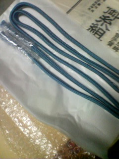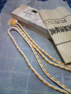 この前、購入した道明組(道明の教室で習った方の作品)の帯締めが気に入ったので、本物の道明も一本いっとくかなと・・オクで落札いたしました。で、本日届きました。いやあ、すっごくしなやかです。古い物みたいなんですけど、きちんとしまってあって綺麗だし、箱に「普段用」と書いてあるのもご愛敬です。白っぽい帯締めは持ってなかったので、良かったなぁ・・しかし安い帯締めとの差は歴然としているので、うちにある安物の帯締め達が色あせちゃうなぁ・・などと思ったり。