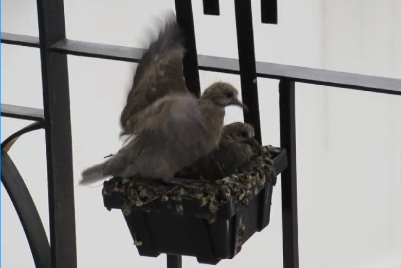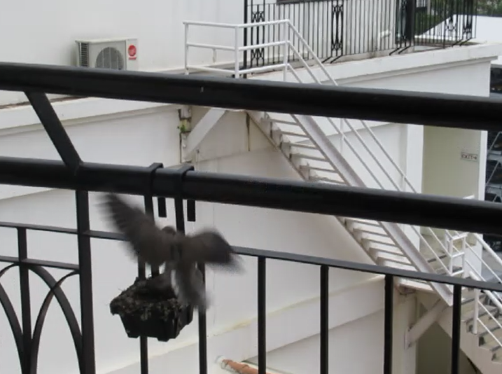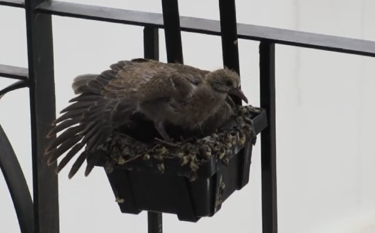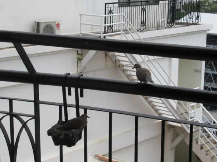 糞だらけの灰皿の巣で、窮屈そうに羽を広げていた2羽ですが、1羽ベランダの手すりに止まっている姿をB子がみつけていました。