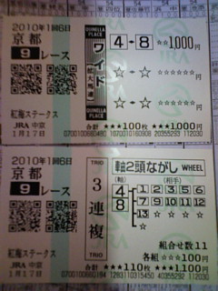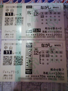 眠いな~、最近寒いと眠くなるんだろうか?なんだか異常に眠いんだが・・・。気づいたら寝てるなんてことがよくある。で、きのうも。そんな感じで眠ってしまったようで・・・起きたらなんと昼の2時とは・・・。あやうく競馬をやりそびれるところだったぜ・・・。もっとも、朝9時ごろまで起きてたから、それがいかんのだが・・・。で、急いで中京競馬場へ。というのも京都10Rの寿S、やりたかったんだよね。ここはもう、いくらなんでもホワイトピルグリムでかたいだろうと。そう思って買ったのはいいものの・・・。3着エアシャトゥーシュがヌケで、いつものごとく撃沈・・・う~ん。もういかんともしがたい。当たらん・・・当たらんのー、おまえはホントに。いったいいつまでこの不的中連続記録が続くのか・・・。そう思いながらも、時間は刻々と過ぎてゆく。そんな絶望の淵の中で迎えた中山メインレース、ジャニュアリーS(OP・中山D1200)だったんだが・・・。ひとすじの光が・・・。ようやく訪れてくれた・・・2010年、念願の初的中、おめでとうございます12番アイルラヴァゲインからの馬単200倍と、ワイド25倍が当たった・・・。それにしても・・・。せこいな~、この馬券。いつも賭けてる金額との比較でいえば、その割合が相当低いんだが・・・。ハズれてるときにドーンと負け、当たったときにシュポッみたいな・・・我ながらなんというなさけない当たり方なんだろうか・・・。まあそれでもアタリはアタリ。まずは当たったことを素直に喜ぶべきか・・・。そう気持ちを切り替えて臨んだ、本日最大のメインイベント、シンザン記念これを迎えるにあたって、多少なりとも気持ちが前向きになれたのはデカい。まあたいした儲けではないが、「延々と当たらない」という慢性的な心理的プレッシャーが一時的に払拭されていたのだ。そう、ここへきて体勢は万全だった。あとは予想どおりに事が運ぶかどうかだけだったんだが・・・。 一応、4番ガルボ&7番シャインのワイド22倍が当たり・・・そして、その2頭軸の3連複400倍が当たってくれた・・・ラッキー・・・。なんというラッキーなんだろうか・・・。ガルボ本命は決まっていたものの、相手をできれば絞りたかったんだよね。で、注目したのが中京2歳Sを勝ってるシャインこの中京2歳Sは相手がかなり弱かったと思い、当初は軽視してたんだが・・・。それでも3着に白菊賞3着のグリューネワルトがいたのと、シャインの勝ちっぷりそのものがただ1頭突き抜けて強い勝ち方だったこと・・・。これらを評価して、急遽、本命候補としたのだ。すなわち、「ガルボ&シャインのダブル本命」とでもいうのだろうか・・・結果論だが、うまくはまってしまったようだ。正直、我ながらちょっと神懸かった買い方をしてしまった感もある。ただね・・・。これはあくまでもおさえ馬券なのだ.ワイド&3連複はあくまでもおさえ勝負はやっぱり3連単だろ?で、ここもいったのだ。当然、[ガルボ&シャインのダブル軸流し3連単]で。だがな・・・。4番ガルボ1着パターンをまったく買わなかったために、3連単はまさかの大チョンボ・・・さすがだ・・・。さすがは我が馬券術・・・。これもこれで先の馬券を超越して神懸かってる気さえするんだが・・・ここには載せてないが、これプラス「4番7番が2、3着だったパターン」も同様に買っている。すなわち、マルチ買いでいうところの、ガルボ1着パターンだけがスコーンと抜けた買い方なのだ。いるだろうか?ガルボ&シャインをダブル軸にすえて3連複総流しをかけておきながら、3連単をここまで見事にハズしてしまう人・・・そして、そんな我が馬券をあざ笑うかのように1着に突き抜けて圧勝したガルボ・・・。思った以上に強かったな、ガルボ・・・。まさかここまで強い馬だったとはな・・・。馬体重がマイナス12キロだったんだよね。「初の長距離輸送が心配」と陣営のコメントがあったため、あ、これはその輸送で失敗したんだなと。そう判断して、「ガルボ1着はない」と買い目をケチってしまったのだが・・・。これがいかんかった。なになに?3連単のオッズが2300倍だと?獲れる・・・。この2300倍は獲れるぞ・・・。そう、ふつうの人なら獲れてたはずだ。ガルボ&シャインを単純にマークシートで「2頭軸マルチ」で塗りつぶせばよいそれで獲れてたはずだ、ふつうの人なら。それがな・・・。おまえにはできなかったというのだから・・・結局、まだ欲張りすぎてるってことなんだろうか?先週の京都金杯でも同じこと反省してたよね?で、その反省がまだまだ活かされてないと・・・?まあ2300倍とはいっても、ここは大勝負のレースではなかったのだ。そもそもシンザン記念そのものに自信はなかったからね。ただな・・・。最も厚めに買った、10番エスカーダ絡みの3連単・・・。14番人気だったんだよね、エスカーダ。直線向いたときに、4番ガルボ、7番シャイン、10番エスカーダが3頭先頭にいたのを目にしたとき