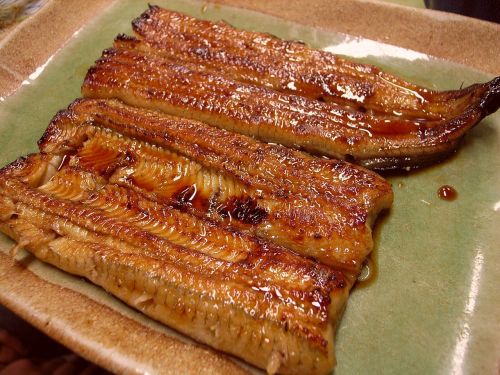 大伴家持(おおとものやかもち)痩せたる人を咲わらへる歌石麻呂いはまろに吾われ物申まをす 夏痩せに良しといふものぞ鰻むなぎ取り食めせ万葉集 3853痩せた人を笑った歌その痩せこけた姿を見るにつけ石麻呂に友としてあえて僕は言う。夏痩せに良いというものだぞ。ウナギを取って食べなさい。註石麻呂いはまろ:大伴家持の親友。石麻呂は字(あざな、通称・ニックネーム)。本名、吉田連老(よしだのむらじおゆ)。鰻(むなぎ):「うなぎ」の古語。語源は「胸黄」といわれる。天然ウナギを見ると、確かに胸が黄色い。よく鰻料理店の壁などに、この歌を刷り込んだポスターが貼ってある。こういった万葉集の「戯咲歌・戯笑歌(ぎしょうか)」の数々は、近世の「狂歌」の源流となり、江戸の知識人であった平賀源内は当然知っていただろう。「土用の丑の日」にウナギを食すという食習慣(恒例行事)を創始した源内の発想は、この辺りから生み出されたと思われ、幕末以降一気に定着した。なお、ウナギは古くは筒切りまたは丸刺しの串刺しで、焼いて食べたものと考えられる。その形が「蒲(がま)の穂」に似ていることから、「蒲焼」の名が付いたという説が有力。「蒲焼」という単語の初出は、いわゆる現在言う形の蒲焼になった江戸中期を遥かにさかのぼる室町時代の1399年(応永6年)の「鈴鹿家記」という本であることも、この傍証となる。ちなみに「蒲鉾」も同様な語源で、原型は今でいう「竹輪」のようなものである。形だけで言えば「きりたんぽ」なども似ている。 ウナギ 蒲焼ウィキメディア・コモンズ パブリック・ドメイン