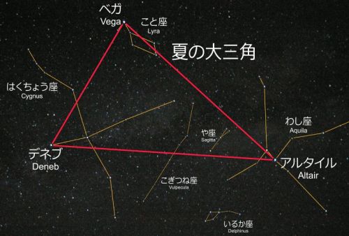 斎藤史(さいとう・ふみ)みじか夜を美くはしといひて惜しみつつやがて眠りにゆくばかりなる歌集『朱天』(昭和19年・1944)短い夜が過ぎて行くのを 短いなりにぎっしりと稠密で美しい時間なのだと言って惜しみながらやがて眠りに入ってゆくばかりなのである。註くはし:現代語「詳しい」の語源の古語だが、精緻で繊細な美しさを言った。古典に、椿や紫陽花の花を「くはし」と表現した例がある。* 作者は、この作品を含め戦前から作歌を始めていますが、主として戦後に活躍した歌人と見られるので、カテゴリーは「現代短歌」に繰り入れます。当ブログサイトでは、原則として昭和20年(1945)8月15日正午以降を「現代」と見なしています。 夏の大三角 ウィキメディア・コモンズ パブリック・ドメイン