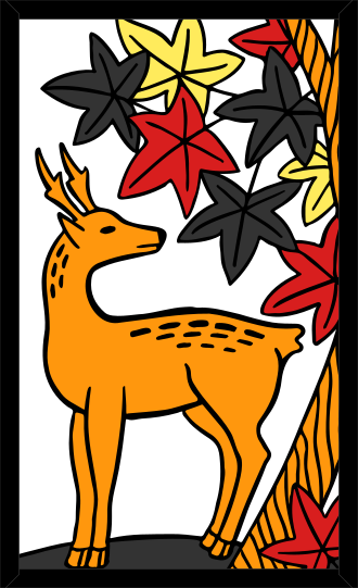 小倉百人一首 五猿丸太夫(さるまるのたいふ、さるまるだゆう)奥山にもみぢ踏み分け鳴く鹿の こゑ聞くときぞ秋はかなしき古今和歌集 215奥山に積もった紅葉をさくさくと踏み分けて鳴く牡鹿の嬬恋つまごいの声を聞くときに秋はしみじみかなしいなあ。註端正に詠まれた名歌。古今和歌集では「詠み人知らず」、小倉百人一首では猿丸太夫作となっている。花札の「紅葉に鹿」の取り合わせは、この歌に依っている。「そっぽを向く、無視する」の意味の俗語「シカト(する)」は、この花札(十月、十点札)の絵柄から来ているという。(とき)ぞ・・・かなしき:強意の係助詞「ぞ」を用いた係り結びで、文末は形容詞「かなし」の連体形。この語法の起源は倒置法ともいう。古典文学の醍醐味の一つともいえる語法。かなし:現代語「かなしい」の語源だが、古語としてはきわめて多義的で簡明な現代語訳は不可能。「心にしみる、強く心ひかれる、胸がいっぱいになる」「いとしい、かわいくてたまらない」「悲しい(哀しい)、切ない」などの感情を包含する重要語。現代語「かなしい」においても、こういったニュアンスは完全には失われていないように思う。 Hanafuda October Louie Mantia、すけじょによる著作物ウィキメディア・コモンズ パブリック・ドメイン