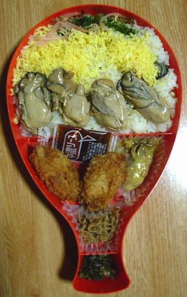 地元・宮島の名産というしゃもじを形どった容器を開けると、中は牡蠣の出汁(だし)で炊いたご飯の上に煮ガキ4粒が載り、カキフライ2個とカキのゆず味噌あえ1つが横に置かれており、まさにカキ尽くし。瀬戸内海名産のジャコの佃煮と広島菜の漬物も添えられています。