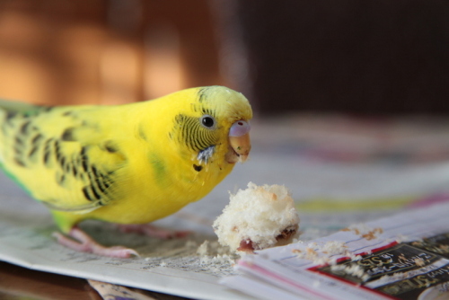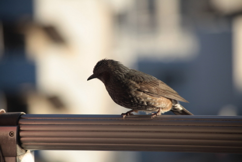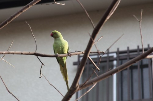 三宝寺池のはずれにあるお宅の二階の軒先に、餌を入れた籠が下 っています。みどり色のオカメインコが十数羽、代わりに餌を ついばんでいます。家のベランダには今日も一羽のヒヨドリが 来ました。
