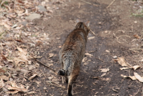 昨日の続きになりますが、ジョンに付いて少し歩くと笹や枯れ草が 円形に踏みしめられた場所に着く。ジョンは真ん中に座って、まる で、此処が自分の場所だと言う風に「みゃー」と得意そうに鳴いた。 「へ~、ここがジョンの家だったの」何だか嬉しそう。 そして、又元の道へ先にたって歩く。途中つめ砥ぎも見せてくれる。 花壇の所まで送ってくれたが、そこからは動きませんでした。 たぶん、自分の家を見せたかったんでしょうね。