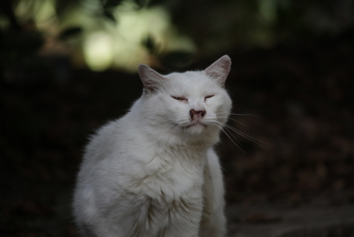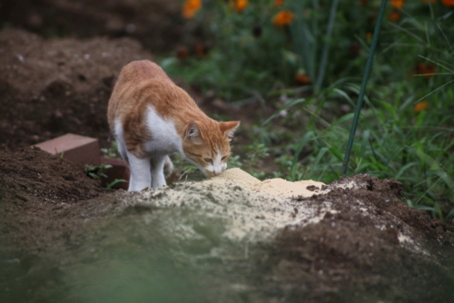 畑の花などを撮って帰ろうとすると、何処からか猫が出てきました。 白と茶のまだ可愛い猫ちゃんです。小父さんが土を作る為に掘り返して ある所に、撒いてあるものを食べ始めました。 多分、おからか、糠かも知れません。野良猫は大変です。
