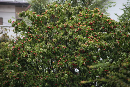 夜は鈴虫の声が大きく聞こえます。この所東京は雨続きの秋のような日が 続いています。 昼間、雨の切れまにちょつと外に出ました 思いがけず、はなみずきの木がびっしりと赤い実を付けています。まるで イチゴのようです。これほどの実は初めてみました。 何だか食べられそうですが・・・・? ワンちゃん達も、雨の合間にお散歩です。ダックスのハチ君です。