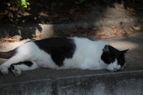 暑さ厳しい昼下がり、ぶち猫と黒猫が日差しをさけて二匹でお昼寝です。 仲良しで、いつも一緒に行動しています。 女郎花も咲きだして、少し季節の変化を感じます。