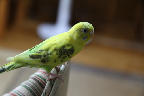 二日程前から、メイは羽根が抜けはじめました。ふわふわの羽毛や シッポの長い羽根も一本抜けました。 頭も短い羽根がツンツンしています。 最近は、動きもずい分活発になり木の玩具もかじっています。 よく動くので、ピントが合いづらくなってきました。だんだん大人の鳥に 近づいているみたい。ただ飛べないのがちょつと可愛そうですが・・・・