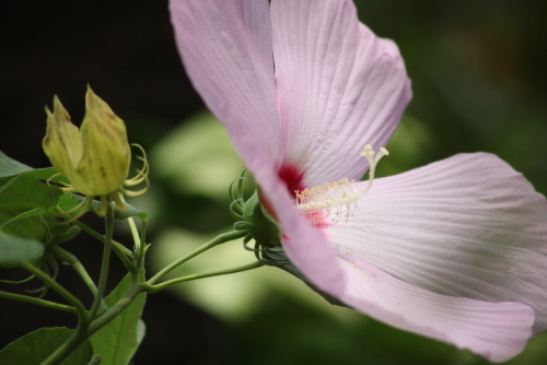 鼻に黒い模様のある白猫です。昨日の二匹の猫達とは少し離れた 木陰にいます。二匹とは、付かず離れずの関係のようです。 芙蓉も、大きなピンクの花を咲かせました。