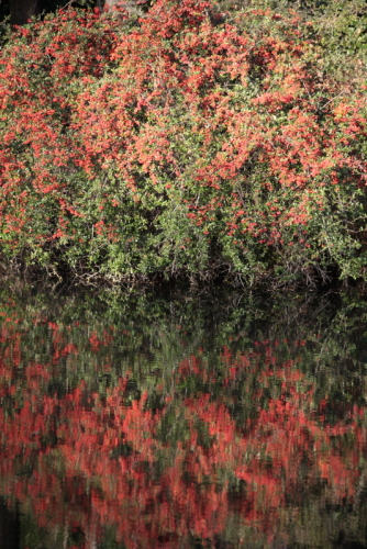 枯れた色ばかりが目立つ三宝寺池ですが、ピラカンサだけは 真っ赤に色付き、鮮やかな色を水面に映しています。