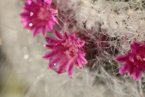 ベランダのサボテンの花が、まあるく咲き揃いました。 ピンクの首飾りのようです。例年より20日も早い開花です。