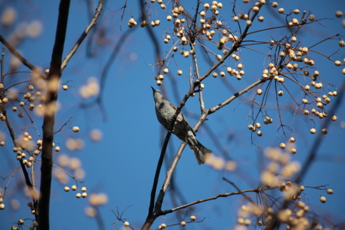 三宝寺池のすぐそば、茶店の前に大きな栴檀の木があります。 毎年今頃になると、沢山の実がなります。 実をついばみにヒヨドリが集まります。食べ物が無い時期なので 鳥達にとってはありがたい木だと思います。