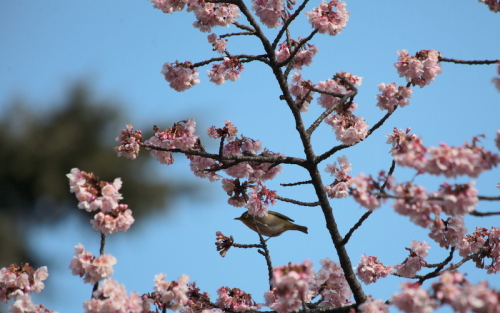 早咲きの河津桜の花の中に、小さなめじろが枝から枝へ・・・・ 花の中に居ますので拡大してご覧下さい。 こぶしの蕾も銀色に輝いて春への準備をしています。