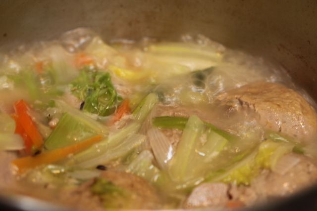 汁ものは、白菜、人参、チンゲン菜、ネギ、イワシのつみれなどをやわらかく