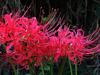 今年初めて明日香の案山子を見に行った。ここ数年いるかの皆さんが行かれるのを聞き行きたく思っていたのだが、私の足では連れて行ってとは言えなかった。ところが今年19同年会で飛鳥に行こうということになり喜んで参加させてもらった。高齢者ばかりの気の合った仲間達~私はここに今年の5月から参加させてもらったのだが実に楽しく気楽な仲間たりである。マイクロバスを借り~多分どこかの会社のバスで運転手さんも仲間の友人だろう~だからとても格安で自由であちこち行けた。最初に案山子、次に古墳を見て、それから風力発電をしておられる所へも、こんなのが彼方此方できればエコーで原発の問題など起きないのだが~兎に角楽しい一日であった。みなさんありがとう~ 彼岸花つんで遊んだ幼き日