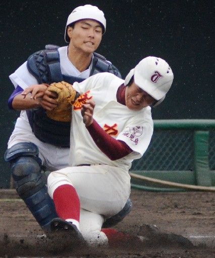鶴丸辛勝、3時間の乱打戦を制す!第143回九州地区高校野球大会鹿児島県予選第3日は9月24日、鹿児島市の県立鴨池、姶良市の姶良、両球場で2回戦5試合が予定されていたが、途中雨のため1試合が順延となった。【2回戦・鶴丸―鹿児島工】4回表鶴丸一死二三塁、1番・福田の二ゴロで三走・髙橋が本塁を狙うも好返球でタッチアウト。捕手・木村=県立鴨池写真/文 政 純一郎 氏 ■ 県立鴨池球場◇第1試合[2回戦] 徳之島 8-1 指宿・頴娃・山川・川辺(8回C) 123456789計徳 之 島200011138連 合 2010000001 ◇第2試合[2回戦] 鶴丸 14-8 鹿児島工 123456789計鶴 丸10002317014鹿児島工0013111108◇加治木 - 出水工 (雨天中止。明日に順延)■ 姶良球場◇第1試合[2回戦] 志布志 6-1 甲南 123456789計甲 南0000000101志 布 志00200211X6◇第2試合[2回戦] 錦江湾 5-1 大口・伊佐農林・霧島・串良商 123456789計錦 江 湾1110011005連 合 30010000001