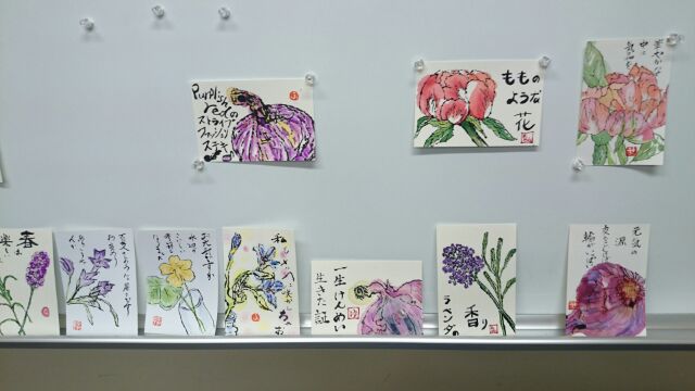 水曜日は、弁天町学習センターの絵てがみ教室でした。前日の阿倍野教室で描いたシャクヤクは、黄色いおしべが見えるか見えないか、くらいの花の咲き具合でしたが暑さのせいか、弁天町教室に持ってきた頃には、黄色いおしべがはっきり見えるくらいの満開。しかも、黄色いおしべの中に、ピンク色の何か!?4~5個あるので、めしべではないと思うのですが、何だろう~?でも、彩りがとても綺麗です!それと今回はFさんが、グミの枝を持ってきてくれました。街中ではなかなか目にすることがありません。枝にたくさんのグミの実がぶら下がっていて可愛い~です。懐かしい!という声も。枝の茶色、葉っぱの緑、グミの実の赤、黄、緑色。色んな色があって絵になりますね~。 【絵てがみ教室のお知らせ】※どの教室に来られてもOKです。※どの教室も時間は、10:00~11:30(*時間変更の場合もあります)※参加費、1,000円/1回毎※道具レンタル、500円/回(筆、顔彩、パレット)要予約※道具一色、3,500円(筆2、顔彩、パレット、筆筒)※いつでも、お試し体験(1,000円)できます。【各教室の日程】ウィルサロン(月or水or金)……6/3(水)、15(月)楽しみカルチャースクール(第3火)……6/16、あべの学習センター(第2,4火)……5/26、6/9、13弁天町学習センター(第2,4水)……5/27、6/10、24弁天町学習センター(不定期 土)……5/30、6/13、27