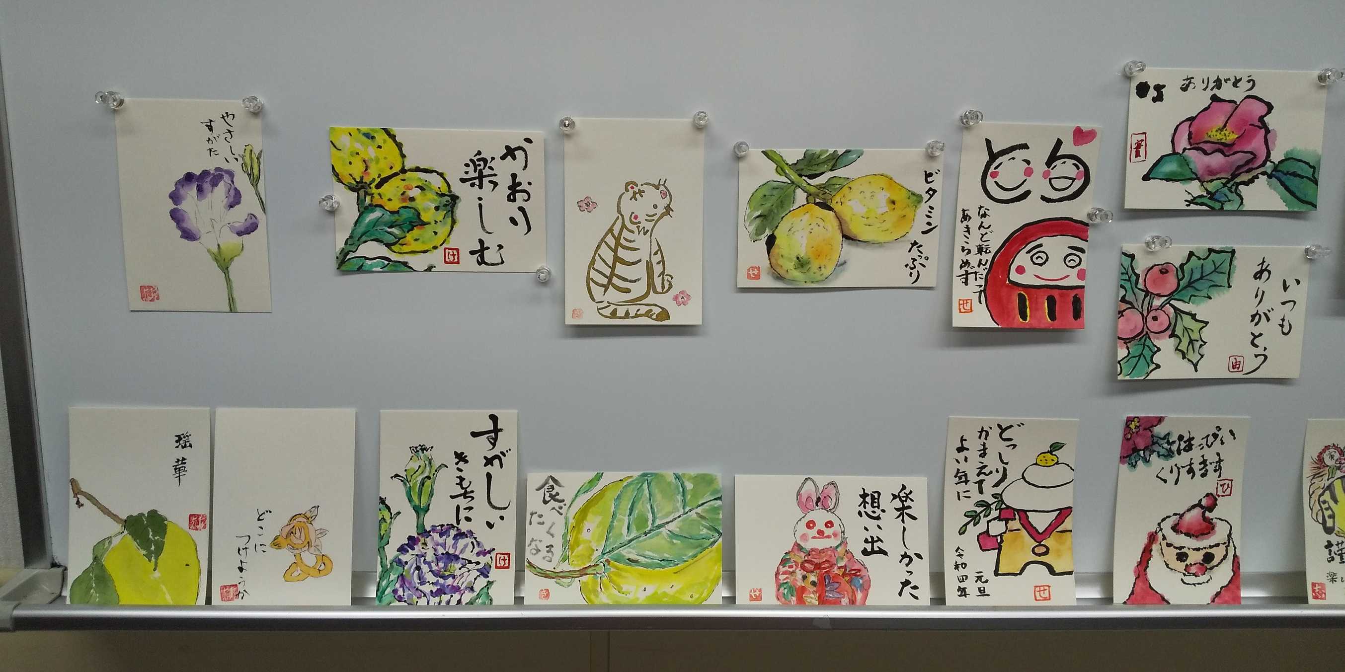 火曜日は、阿倍野市民学習センターの絵てがみ教室でした。 今回は、体験教室を開催。3名の方がご参加くださいました。 阿倍野教室は、たくさんの方々が長く通ってきてくださるので、今回も、ワイワイと楽しく過ごして頂けたと思いますが、私がバタバタしてしまって、お待たせすることもあり、すみませんでした。 体験の3名さんは、題材選びの時から「難しそう、、、」とおっしゃってましたが、絵てがみを描き始めると、集中されて、素敵な絵てがみが出来上がりましたよ。 他の参加者の方々も、絵てがみ年賀状や、クリスマス絵てがみなど、いろんな絵てがみがいっぱいです。 また、来年もよろしくお願いいたします。 【 参加の際のお願い 】 ご自宅で検温し、発熱や体調が良くない時は、無理をなさらないように。 マスクを着用してください。 施設に入館した際に、入り口でアルコール消毒液で手指を消毒してください。 教室内は、換気のために窓や扉を開放することをご了承ください。 【絵てがみ教室のご案内】 ※どの教室に来られても大丈夫です。 ※時間は、10:00~11:30まで。(変更がある場合はお知らせします) ※参加費 1,000円/1回毎 ※道具レンタル(予約) 500円/回(顔彩、筆、パレット) ※ハガキ(10枚入) 300円 ※道具一式 4,000円(顔彩、筆2本、パレット、筆入れ、水さし) ※いつでも、お試し体験できます。1,000円/回 【各教室の日程】 ※ウィルサロン(都島区)…12/15(水) ※阿倍野学習センター(第2,4火曜)…1/11、25、2/8、22 ※港区民センター(不定期土曜)…12/18、1/8、15 ◆絵てがみ教室~メイユール~◆ お問合せ先はこちら(●を、@に変えて送信下さい。) meilleurbaby●gmail.com