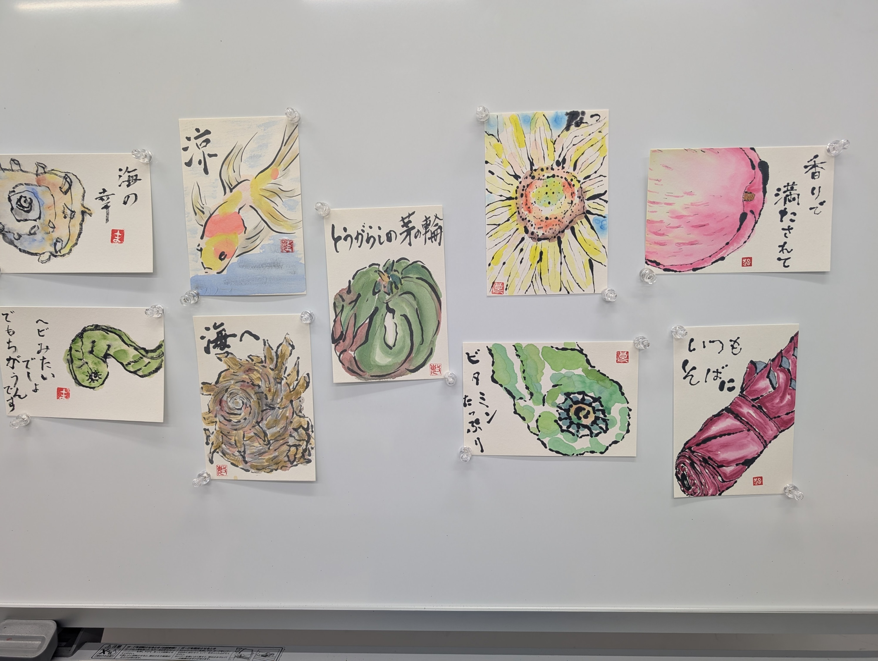 絵てがみ教室メイユールです。 土曜日は、港区民センターの絵てがみ教室でした。 まだまだ暑い日が続いていますね。 涼しさを求めて、金魚の絵てがみを描いてもらいました。 ゆらゆら水の中で泳ぎ回ってる感じが、良く出ていますね。 涼しそうです! また、今、開催中の大阪万博公式キャラクターである「ミャクミャク」も描いていましたね。 この「ミャクミャク」は、毛糸で編んだ紐状の編み物をミャクミャクの形にして、目玉はボタンを付けて、後ろに安全ピンをくっつけて完成させたそうです。 それを、絵てがみに仕上げて、2つも3つも楽しんでおられますね! 素敵です。 花や野菜だけでなく、身近なものも絵てがみの題材になります。 きっと、何年か経ってからこの絵てがみを見ると、「大阪万博の時に描いたんだなぁ〜」と思い出されますね。 それもまた楽しみですね。 【各教室の日程】 ※金国(京橋)…9/10(水) ※ウィル(城東区)…8/27、9/24(水) ※阿倍野学習センター(第2,4火曜)…8/26、9/9、30 ※港区民センター(不定期土曜)…9/6、27 【絵てがみ教室のご案内】 ※どの教室に来られても大丈夫です。 ※時間は、10:00~11:30まで。(変更がある場合はお知らせします) ※参加費 1,000円/1回毎 ※道具レンタル(予約) 500円/回(顔彩、筆、パレット) ※ハガキ(10枚入) 300円 ※道具一式 4,500円(顔彩、筆2本、パレット、筆入れ、水さし) ※いつでも、お試し体験できます。1,000円/回 ◆絵てがみ教室~メイユール~◆ 三間 美由起(みつま みゆき) お問合せ先はこちら(●を、@に変えて送ってください。) meilleurbaby●gmail.com