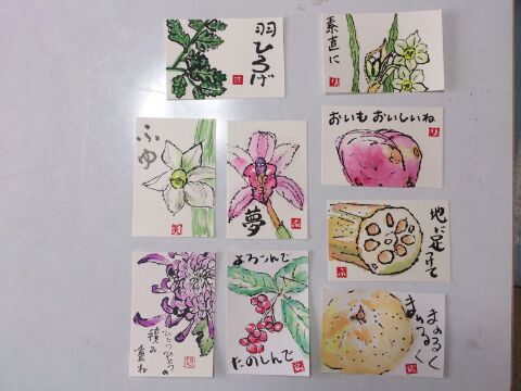 みかん、さつまいも、れんこん、一輪の水仙が、それぞれ5分で仕上げた絵てがみです。
