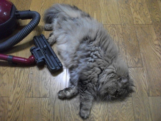 またしても、久しぶりの更新です。全世界のめめファンの皆様、お待たせしました(笑)ここ最近、暑くなってきたのか、めめはこんな状態になっています。置きっ放しの掃除機のそばに、地べたでゴロンと寝ています。ん?掃除機を片付けたかったのですが、ここで掃除機に触れると、掃除機嫌いなめめは、弾丸のように逃げるのでやめました!?さぁ、梅雨も間近ですが、今年の夏の節電対策は、どうしましょうかね・・・