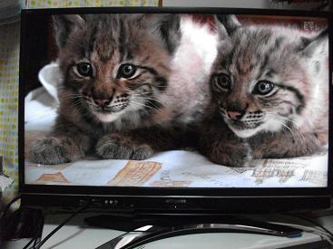 昨夜、スロバキアの山の中で、オオヤマネコを保護し、自然に戻す活動をしている人のドキュメントを観ました!?放送では、2匹のオオヤマネコの兄弟にスポットを当てられていて、山小屋に住む夫婦が2匹が野生に返っても困らないように飼育している姿が出ていました。部屋の中にいたら、普通のペットみたいですね!?私たちがTVを観ていると、めめもジッと観ていて、しまいにはTVに近づいて観ていました。ボクは野生に戻れないよ~