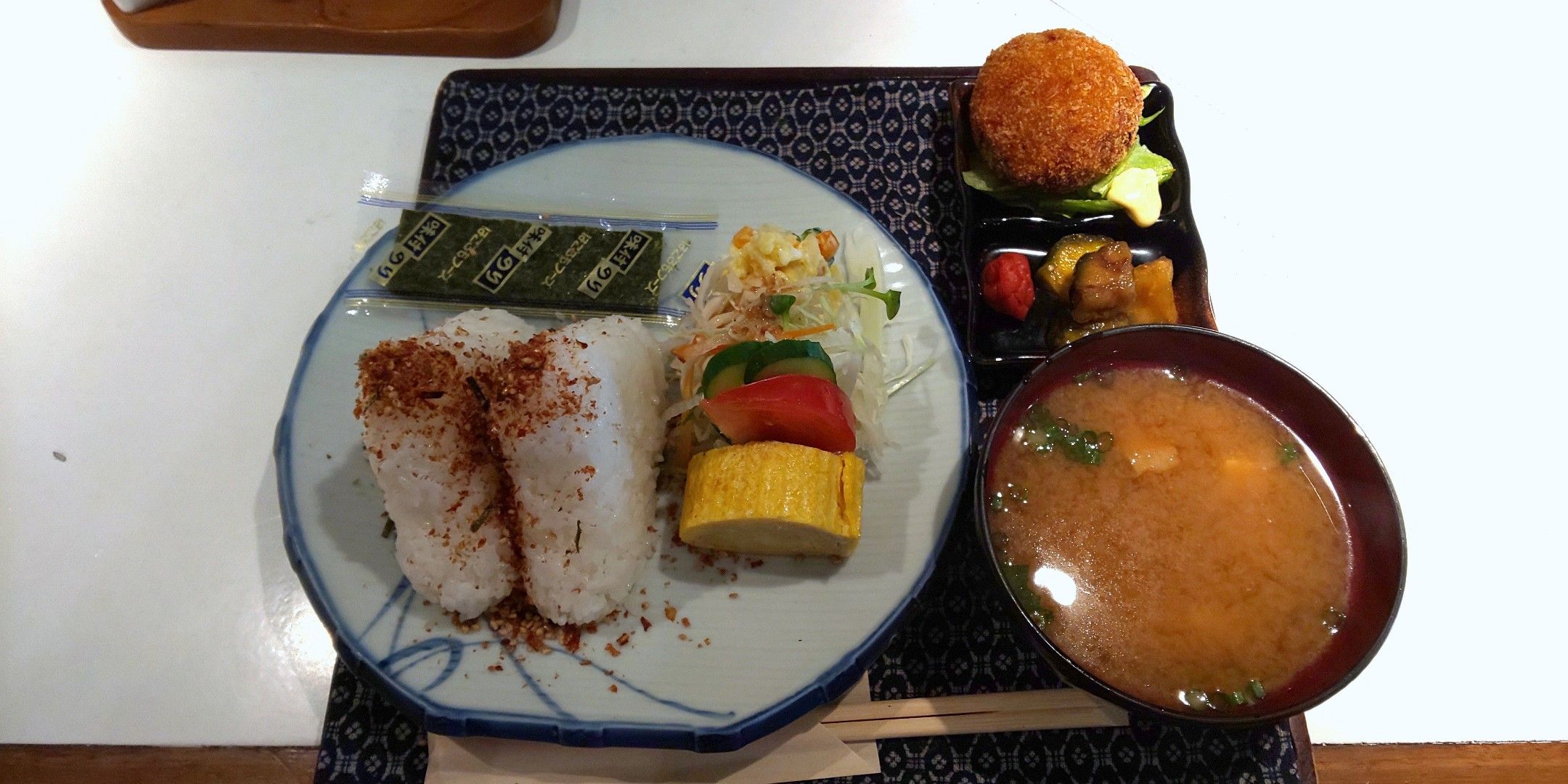 昨日の昼は、詫間の八幡さんの下にある喫茶店の庵(ANN)。モーニングとランチメニューが同じで、和風セットを選ぶ。ドリンク+300円。コーヒーは400円。 おにぎり程度かと思ったらカボチャコロッケも付くなかなかの豪華版。 食事にお得に飲み物付けるか、飲み物にお得な食事付けるか、どっちが店にとって得なのだろうか。