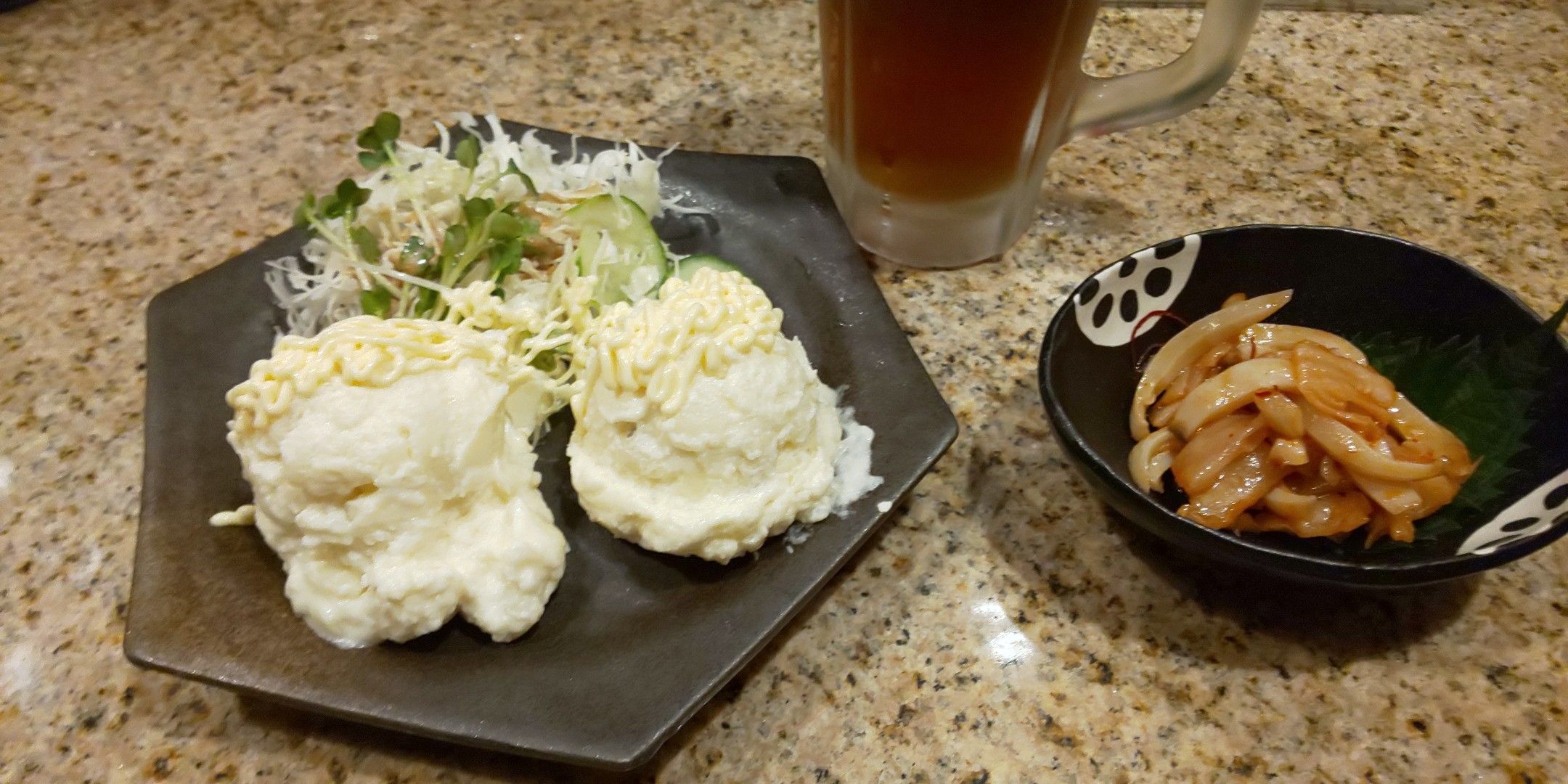 昨日の夜は、豊中町の田園地帯にある居酒屋里来家。食事だけでもOKと看板にあったので入った。検温されて、手の消毒を求められる。 丼もあったがメニューは居酒屋。 ポテトサラダをたのむ。飲み物と突出しが出てくる。完全な居酒屋や〜。 お薦めのカマ焼と豚キムチ丼をたのむ。 全部で2100円。美味しくて満腹になったが滞在時間は30分弱、飲まないと食事ってすぐ終わる(笑)。