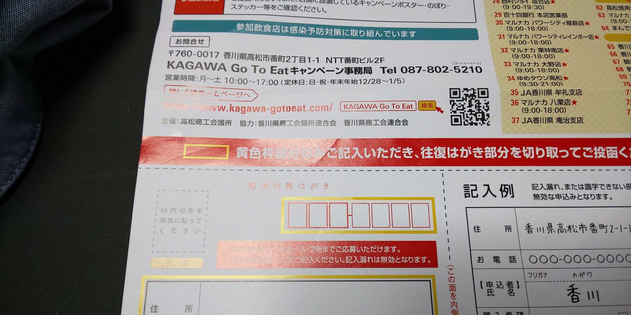 KAGAWA Go to Eatの応募用往復ハガキを手に入れた。 善通寺市の50%プレミアム付き応援商品券に比べて、25%のプレミアムってショボイなぁと思いつつ、応募を迷ったが、その前にどう切手を貼ろか悩んだ。貼るスペースがちょうど普通切手サイズしかない??? 日本郵政の記念切手乱発に愛想が尽きて最近は、城とか国宝とか興味あるのしか買ってないけど私は葉書料金が7円(金魚)の時代からの切手収集家。郵便に使う切手は死ぬまでストックがある。 今は郵便の利用機会が少ないので、デザイナーは、大きい切手や複数枚貼ることに気が付かなかったのだろうか。それとも裏面貼付を知るコアな郵趣家だったりして…。 それから10日、結局応募したら、当選した。どうも全員当選だったらしいが(笑)。