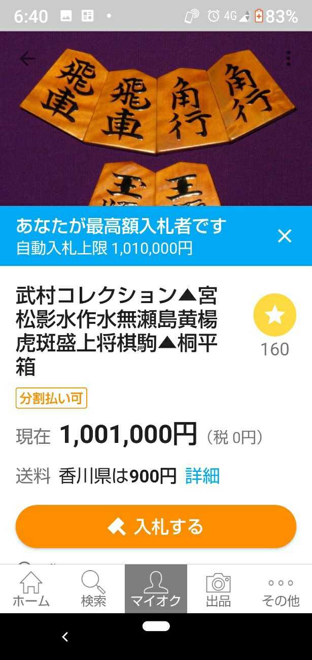 家族からはいい加減にしろと言われるが、掛軸を買うためヤフオクをよく見ている。将棋も興味があるので駒もウオッチしてる。 今、著名な駒コレクターが所蔵していた宮松影水の虎斑駒が出品されている。一昔前『夭逝した天才駒師』影水師の駒は最低一本と言われていたそうである。 今はそんなこともないだろうが、この駒なら最低でもその程度にはなるだろう。 昨日期待半分で札を入れてみたが、〆切までに1日以上あるのに他に誰も入札しなければどうしようかと内心ビクビクしていた。 8時間ほどで高値更新されて一安心なのはずなのに、なんとなく残念なのは残念。 いくらになるのだろうか?ヤフオクには別の出品者から影水の孔雀杢の駒が2割5分増しで即決で出品されたままになっている。ここまでになると悔いはないが、私の札に近いところで決まると悔しいだろうな。私の性格だときっと札を入れてしまうな。支払いは他の所有する駒全部売って掛軸も売って足らずは給料前借りして…。今競ってるのは私以外に2人。今夜運命は決まる(笑)。