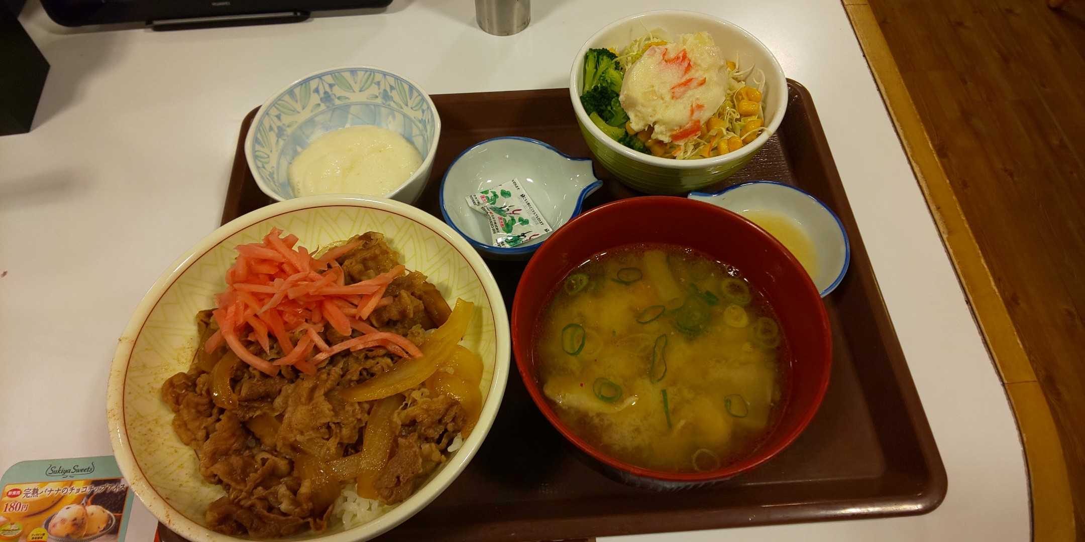 昨日は土曜出勤。夜まで仕事したので、夕食は、期限が迫った優待券ですき家の牛丼。 遅めだったので健康のため定番のチーズを避け、わさび山かけ牛丼(中盛)塩麹とん汁+ポテトサラダでジャスト千円。 名前は立派だけど、要するにトッピングで山かけとわさびが付くってことか。ポテトサラダととん汁でボリューム満点。 優待券を計算してピッタリ使ったり、期限ギリギリで使うってあの桐谷先生に行動が似てきた(笑)。