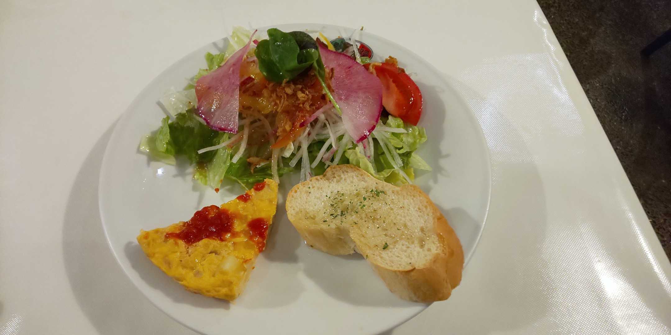 昨日の昼は、仁尾町のサンリゾート仁尾内のサンカフェ。ピザが売り物らしいけど一人じゃ種類が食べられないので、窯焼きチーズハンバーグ1408円+サラダ飲み物バー330円+ライス110円。 サラダバーが時節柄で前菜に。これにライスだけでも十分なレベル。 前菜を食べ終わった頃、自慢の薪窯で焼いたハンバーグ〜。食べ応えがある。 サンリゾートは、バーベキュー・キャンプ場・テニス場等を備えた施設。父母ヶ浜から峠を越えた家の浦にある。もっと行くと浦島太郎伝説のある丸山島がある。ただ海に近いがカフェからは瀬戸内海の景色が見えないのが残念。