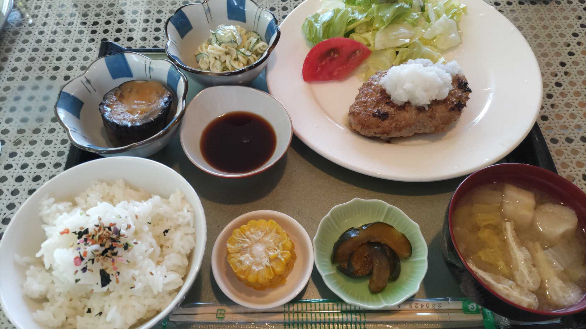 昨日の昼は、目指した店が臨時休業、で多度津町の喫茶もみの木。タイムはメインが白身魚とハンバーグ、ハンバーグ選択850円。小鉢も付いて豪華、ハンバーグ手作りっぽい。遅れてデザートの小鉢が。コーヒーも付いてます。常連さん達が3組。カフェじゃなく喫茶店だな。ちょっとだけど脇にそれるから普通には発見出来ない〜。
