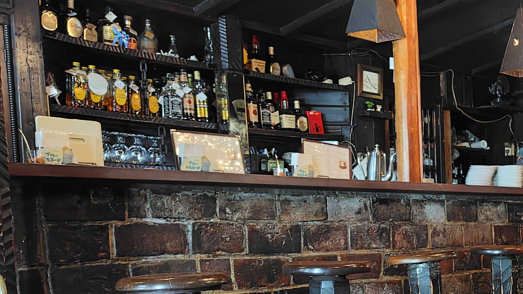 戦後すぐの開店、山小屋のような空間。そう言えばウィンナーコーヒーって初めて飲んだ〜苦味と甘味こんなに美味しかったんだ(笑)。ずらりと並んだお酒、夜はお酒が飲めるらしい。