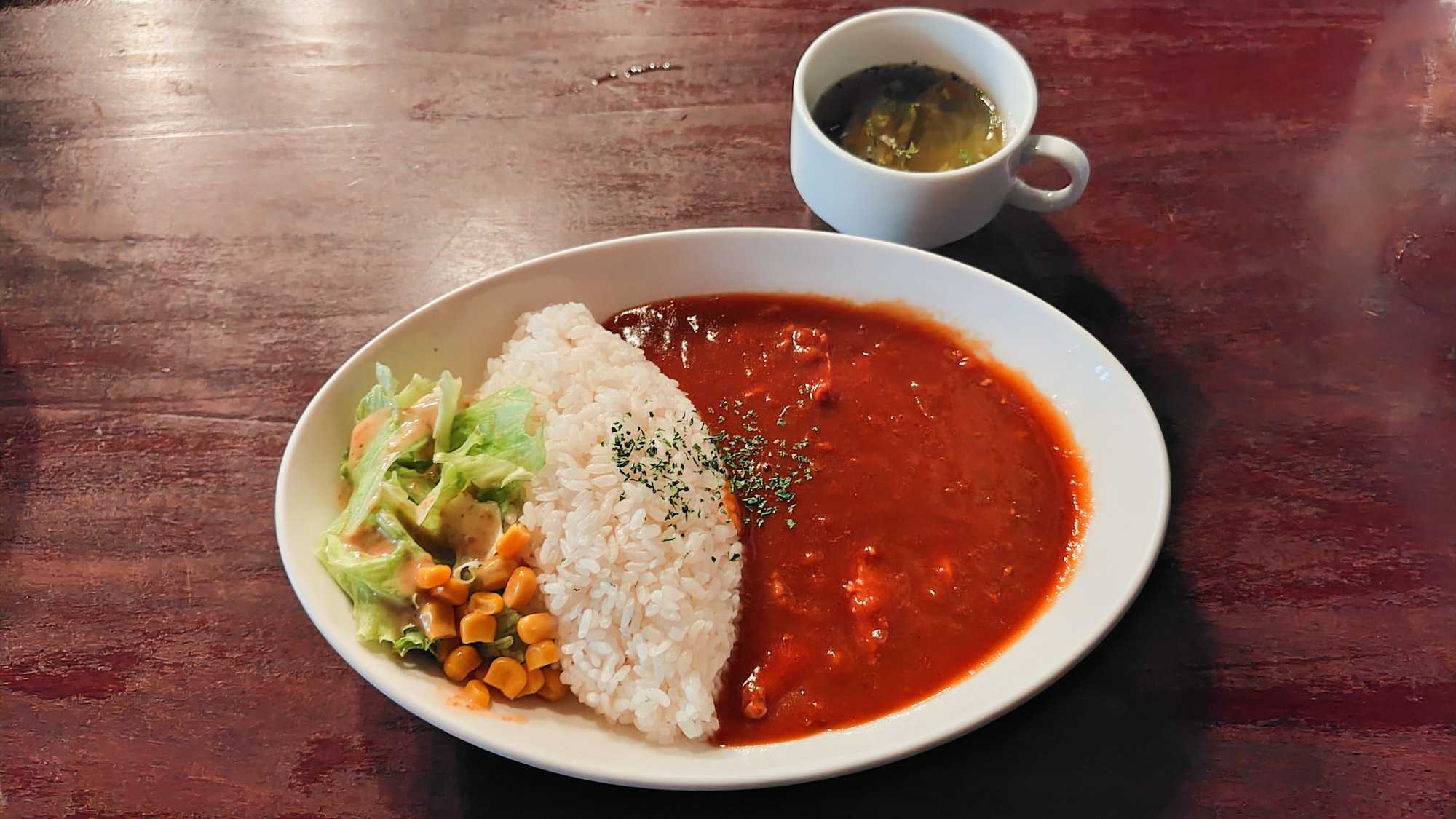 ランチはナポリタンかチキンカレーの2択。ナポリタンはスプーンで美味く食べられないのでチキンカレー選択。スープ・コーヒー付で1300円。