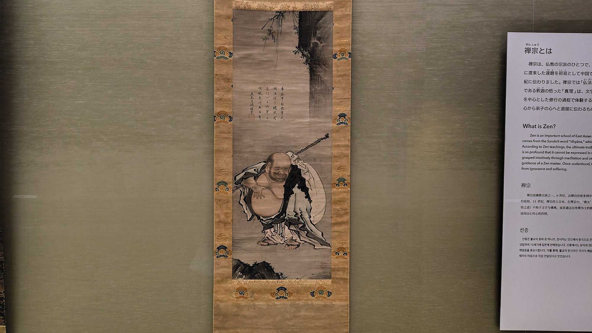 本館2階で、大威徳明王(談山神社)、西園寺実氏夫人願文、 平行政願文、布袋図 正信、 重陽上堂偈 無学祖元(常盤山文庫)、小袖 染分綸子地若松小花鹿紅葉模様。